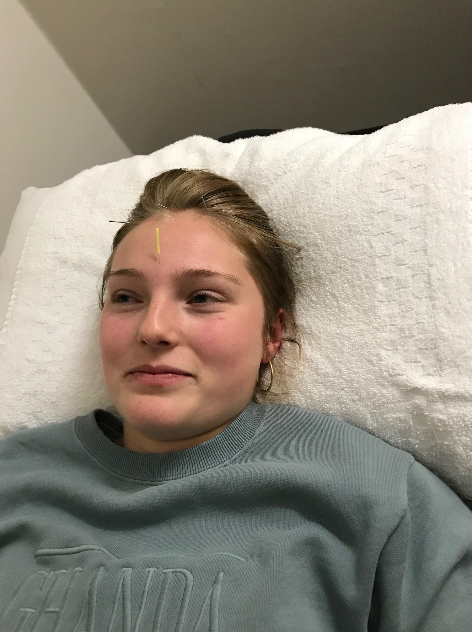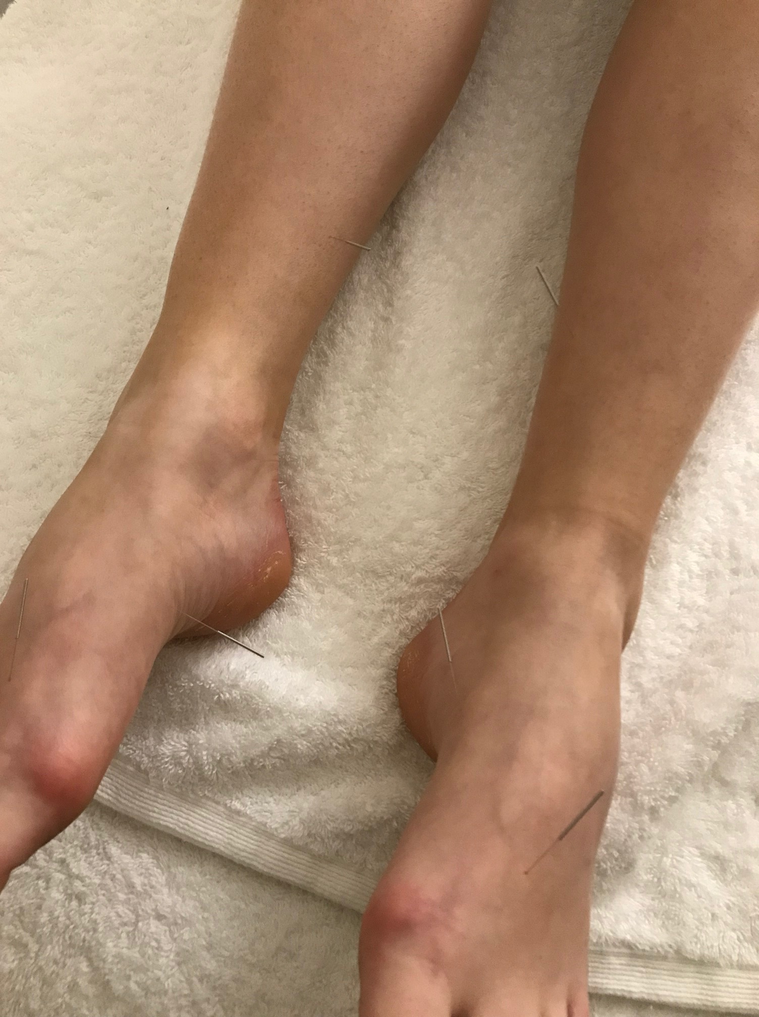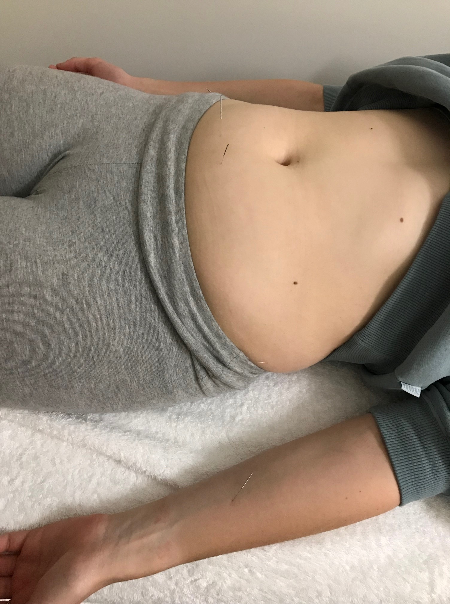 After all that, I hopped up on the bed do start with acupuncture. We did really similar spots to last time. Some on the feet and lower shins like last time, one in between the tendons in my right arm, one on my left arm, four in my head, one on my upper stomach like last time and a couple in my lower stomach (see below). Please don’t mind my facial expression, it’s actually very awkward having your Chinese doctor take photos of you with needles in your head surprisingly!